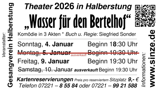 Die Abholung sowie Bezahlung der reservierten Karten und der Verkauf der Restkarten erfolgt am Samstag, 13. Dezember von 11-12 Uhr in der Bürgerbegegnungsstätte in Halberstung (Schiftungerstrasse 13).